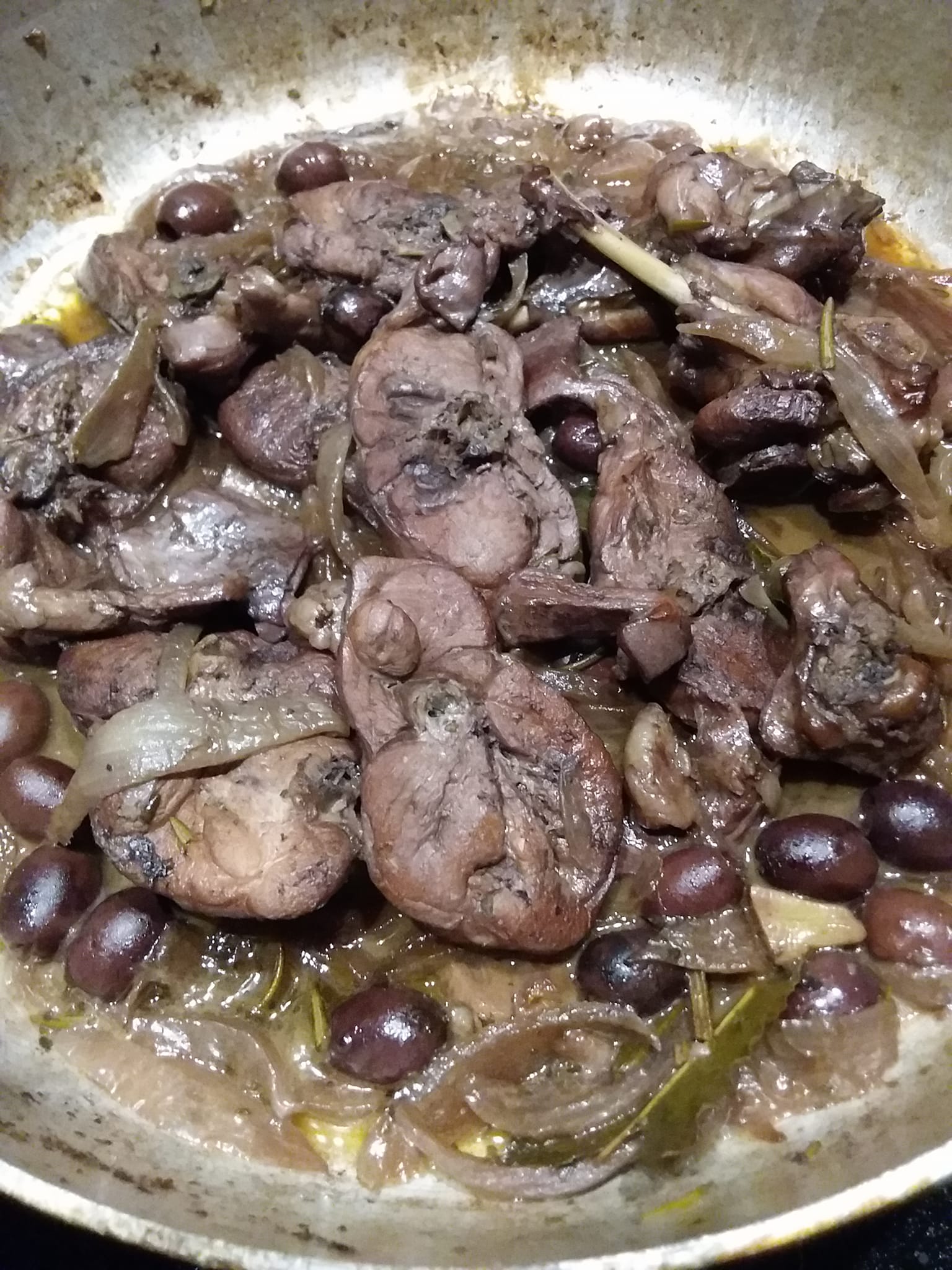 1 cipolla 1 spicchio d’aglio Olio di oliva Coniglio nostrano a pezzi Olive taggiasche 1 bicchiere di dolcetto rosso Alloro fresco Maggiorana La suite en page suivante