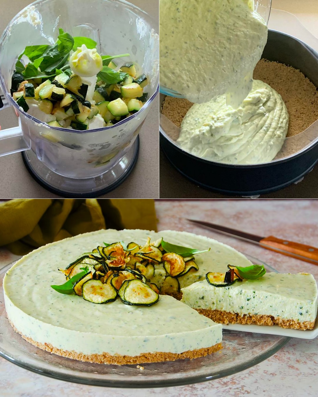 La base si realizza mescolando crackers tritati con burro fuso, mentre il ripieno cremoso è preparato frullando zucchine cotte con ricotta, parmigiano e basilico. Il tutto viene rassodato in frigorifero per almeno 3 ore, regalando un piatto ricco di gusto e facile da preparare in anticipo.