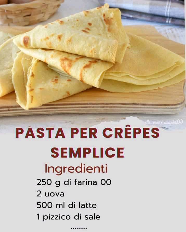 Pasta per Crêpes Semplice -Ingredienti (per circa 8 crêpes): 250 g di farina 00 2 uova 500 ml di latte 1 pizzico di sale 2 cucchiai di burro fuso (oppure olio) 1 cucchiaino di zucchero (facoltativo, se fai crêpes dolci) -Preparazione: vedere il seguito alla pagina successiva