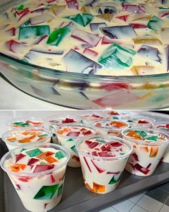 La gelatina di mosaico è un capolavoro colorato e delizioso che unisce il divertimento visivo al piacere rinfrescante. Questa affascinante creazione è più di un dessert; È una festa per i sensi e un’esperienza culinaria che piace sia ai bambini che agli adulti. La varietà di colori e sapori in ogni strato di gelatina crea uno spettacolo visivo accattivante. Dal rosso vibrante al giallo brillante, la gelatina a mosaico è un arcobaleno commestibile che illumina ogni occasione. Ogni boccone è una sorpresa, poiché i diversi sapori si intrecciano in una deliziosa danza sul palato. La consistenza liscia e fresca della gelatina, combinata con la morbidezza del latte condensato e della gelatina non aromatizzata, aggiunge una dimensione in più al piacere di mangiarla. La scelta di tagliare la gelatina a cubetti aggiunge diversità tattile, trasformando ogni porzione in un piccolo gioiello commestibile. Ecco una ricetta semplice per preparare la gelatina di mosaico: