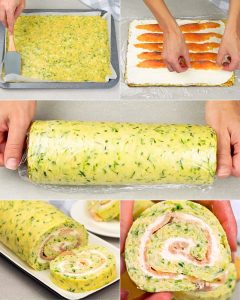 Il rotolo di frittata alle zucchine è un antipasto sfizioso e fresco, una variante del rotolo di frittata, arricchito con zucchine grattugiate e farcito con formaggio cremoso e salmone affumicato. Per realizzarlo basterà sbattere le uova e amalgamarle con le zucchine grattugiate e il parmigiano. Il composto sarà poi cotto in forno farcito con formaggio cremoso e salmone affumicato e arrotolato. Il tutto sarà poi lasciato raffreddare in frigo per 4 ore, prima di essere tagliato a fette e servito. Ecco come prepararlo.