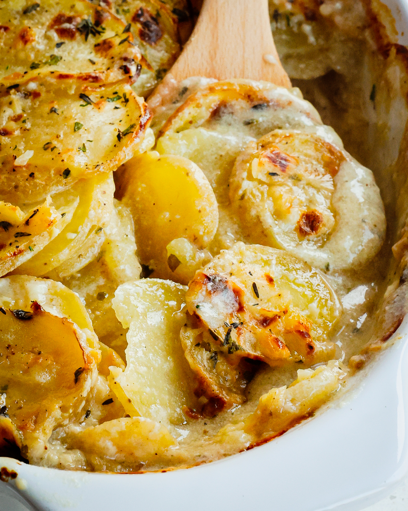 These delicious Classic Scalloped Potatoes are made easily with sautéed onions and garlic, creamy sauce, fresh herbs, and plenty of salt and fresh ground black pepper. This is, hands down, one of our favorite side dishes. It is easy to make, delicious, reheats well, and goes with almost any main course. They are the perfect side dish for Easter, Thanksgiving, or Christmas.