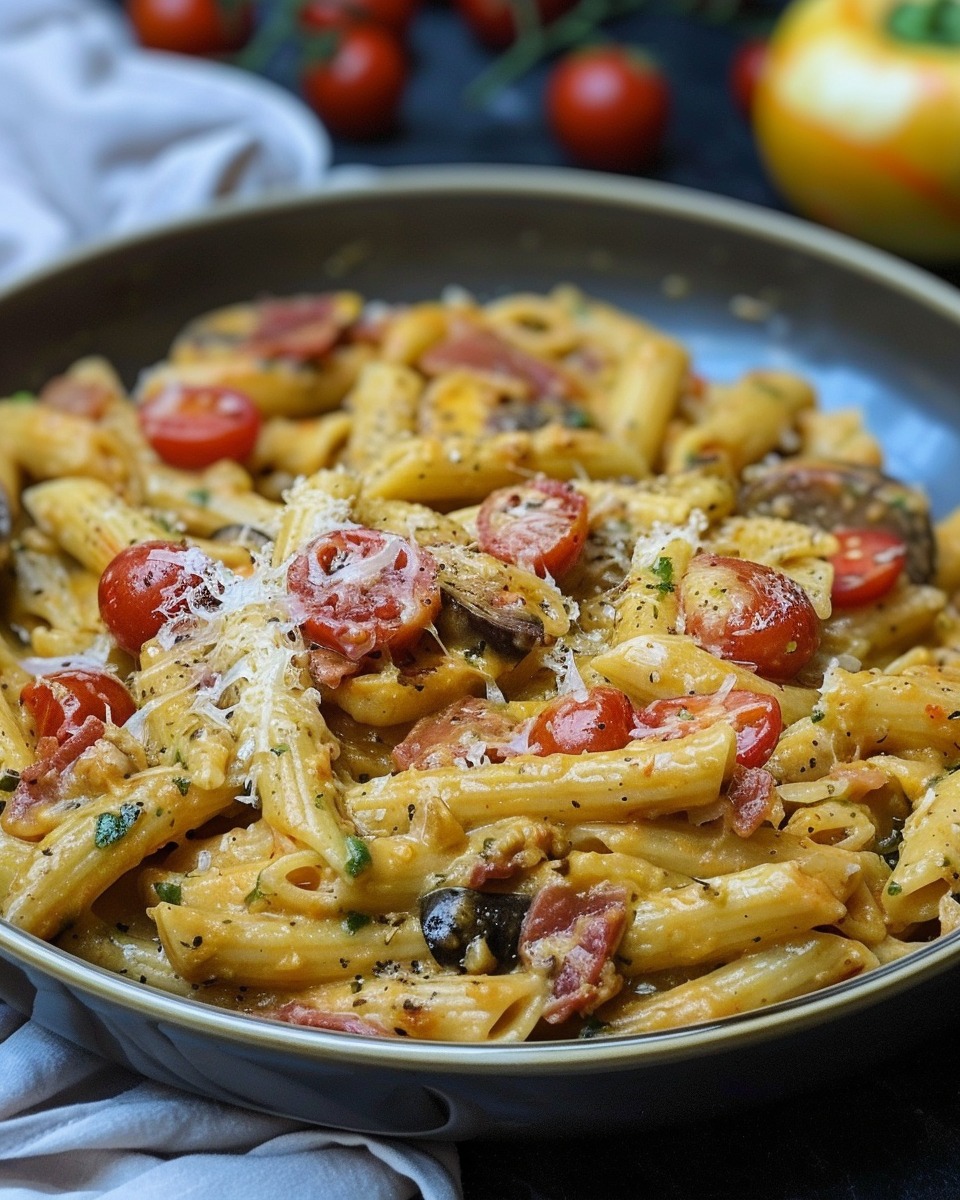 Tortiglioni con Melanzane, Pancetta e Robiola