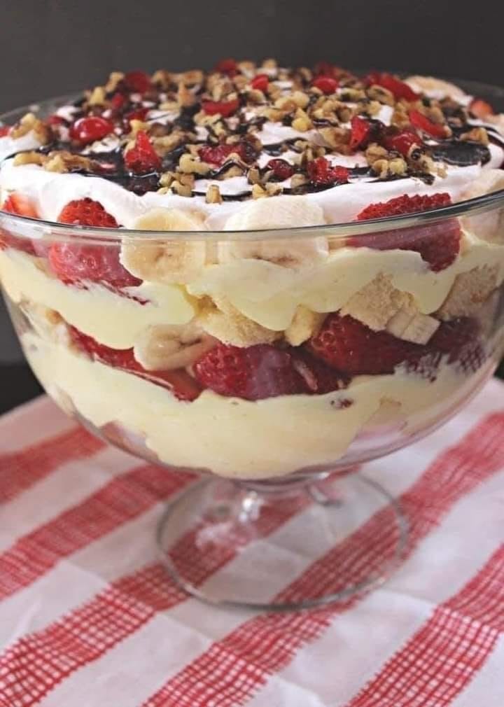 Questa sciocchezza alla banana split presenta strati di pound cake all’ananas, crema alla vaniglia, ganache al cioccolato, fragole e ananas, il tutto coronato da panna montata e ciliegie al maraschino. È un piatto che gli appassionati di dessert si metteranno in fila per mangiare.